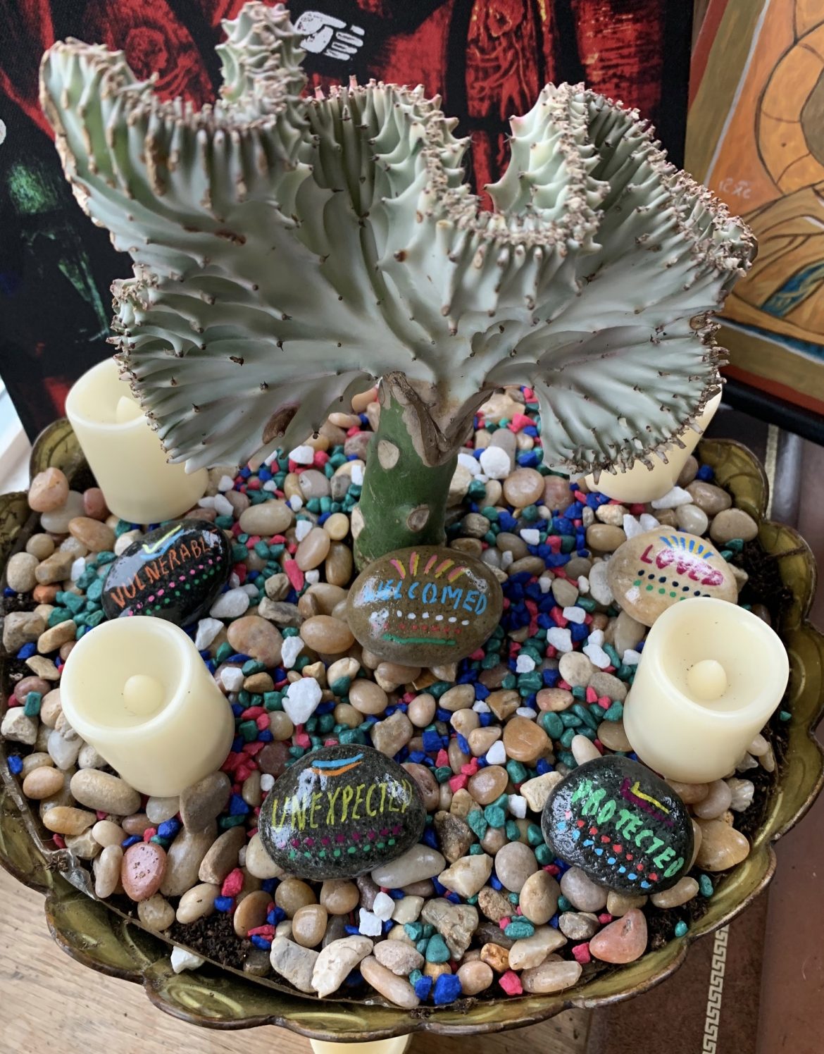 I finally got it together – my Advent prayer garden for 2019. I have been struggling with the imagery this year. What plants can I use that arrest my attention in unexpected ways at this season? I would have loved to be able to use a Waratah, Christmas bush and Christmas bells and other symbols of Advent in Australia – not wintery and cold but sunny and hot, but as you can imagine these were not easy to find here in Seattle. So this succulent was my choice – a little different, startling and in some ways unexpected.