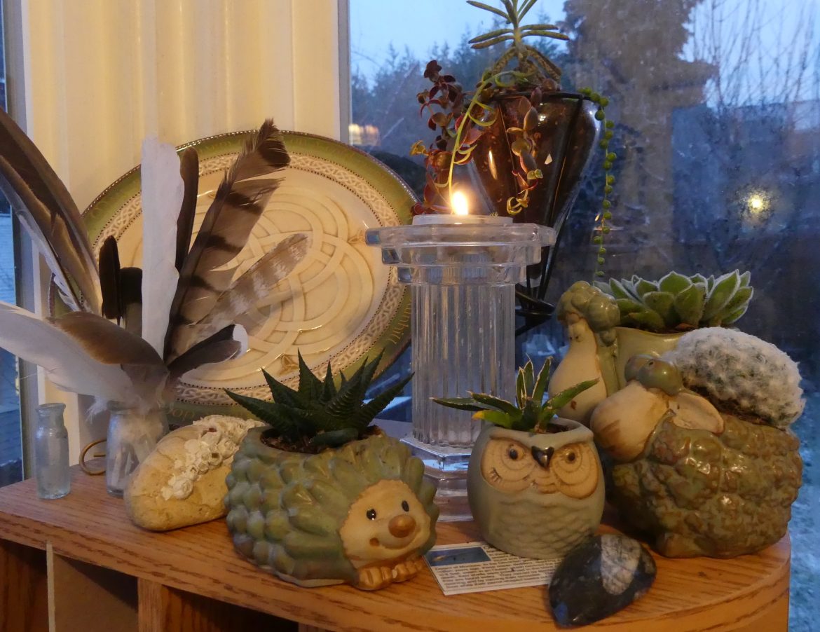 The long awaited day has arrived. Joy has come down, a new world has begun. Yet as I sit here this morning I am very aware of the places where joy still needs to be revealed. It is reflected in my rather unusual nativity scene this year – A Christ candle shining brightly in the middle of an array of animal planters with succulents in them.