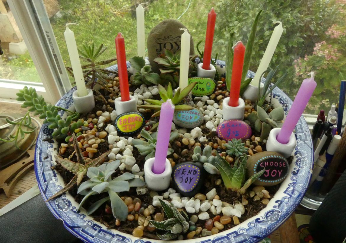 If you choose to start Advent early, you might create something different for the first two weeks and then go to the more traditional Advent wreath on the first Sunday of Advent, December 3rd in 2017. One year I started with fall colors before traditional Advent began and then took out the brown ones and removed the leaves and left the dark green for my wreath. Last week we created a centerpiece of Thankfulness. We lit the candles for things we are thankful for. I filled a container with sand and then used birthday candles for our prayer candles. We are doing this as a reminder to be grateful as we approach Thanksgiving here in the States.