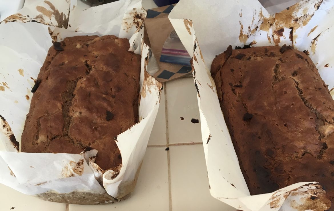 5. Divide mixture and bake in 2 greased loaf tins for about 50-60 minutes, until golden brown and a skewer poked in the centre comes out clean. Leave in tin to cool