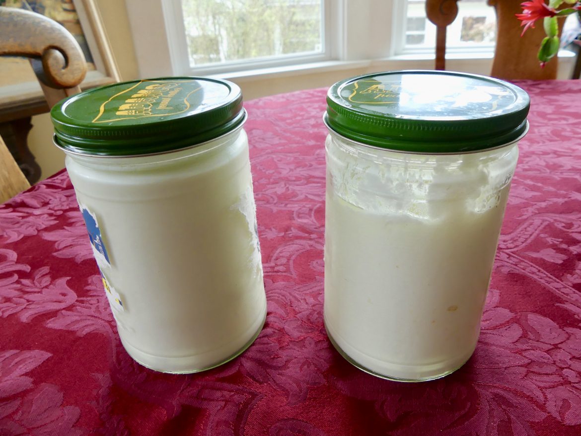 - Keep covered, at 120F, for at least 6 hours, or until set to the consistency of thick cream. (For this step, I pour it into old glass peanut butter jars with metal lids and cover it with a warm blanket and place in a warm room. Alternatively, put it in your oven preheated to 150F and turn it off. Wrap the yoghurt in a blanket or towels and set it in a pan all wrapped up. After three hours REMOVE THE JARS , reheat the oven, turn it OFF again and put the jars back.)
