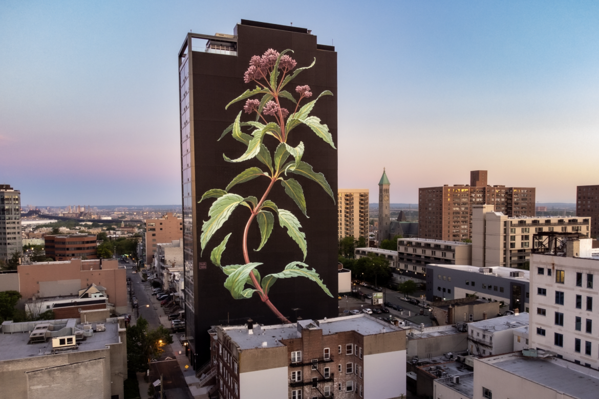 With her “Weeds” murals, Caron has shifted. Instead of time-intensive, extremely detailed depictions of an entire neighborhood shrunk down to the size of a wall or side of a building, she is now often expanding a single stalk of a plant into a large-scale mural that covers an entire large wall or even the side of a several-storied skyscraper.